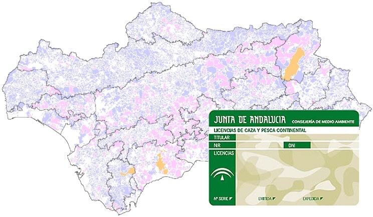 Mapa de áreas cinegéticas de Andalucía y licencia para la Comunidad.La Junta de Andalucía ha implantado desde el pasado día 26 de diciembre la expedición telemática de las licencias de caza y pesca en la comunidad autónoma a través del Portal de la Caza y de la Pesca continental de Andalucía. En él, se explican detalladamente todos los pasos para conseguirla, un trámite necesario para la práctica de estas actividades en la Comunidad Autónoma de Andalucía.