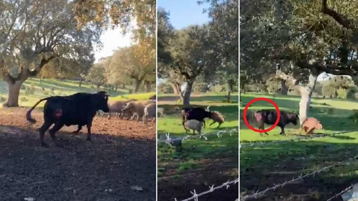 Esta es la cruda realidad de la naturaleza: una vaca brava que lleva una cornada en su parte trasera levanta por los aires a un cochino de cebo. Te mostramos el vídeo.