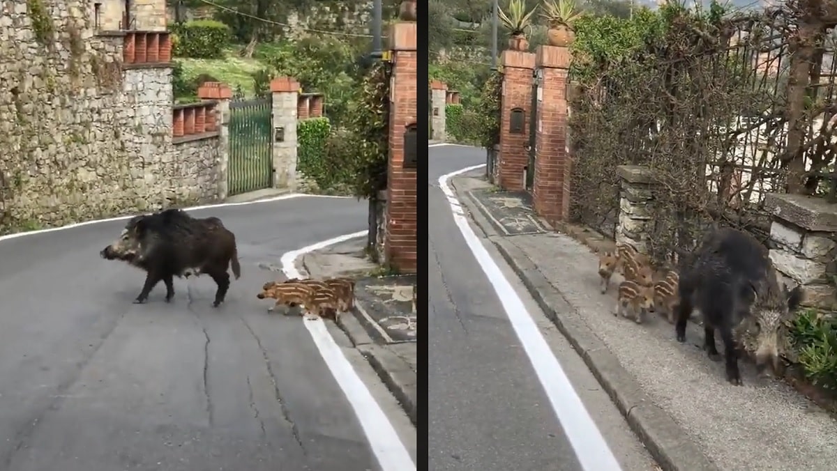 El siguiente vídeo filmado en Perugia -en el centro del país-, y en el que se ve a una jabalina seguida de sus crías caminando por el centro de la ciudad, es solo un ejemplo. También en Génova y en muchas otras ciudades se han visto jabalíes deambulando por el casco urbano. Aunque era algo que ya sucedía antes, llaman la atención las grabaciones a plena luz del día y sin gente que ahora corren como la pólvora en las redes sociales.