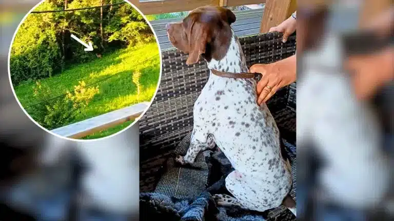 Lo primero que vemos en el vídeo es a un braco sentado sobre un banco de mimbre que su dueña tiene colocado en la terraza. Casi sin moverse un centímetro, este observa inmóvil la presencia, a lo lejos, de un corzo que casi es imperceptible.