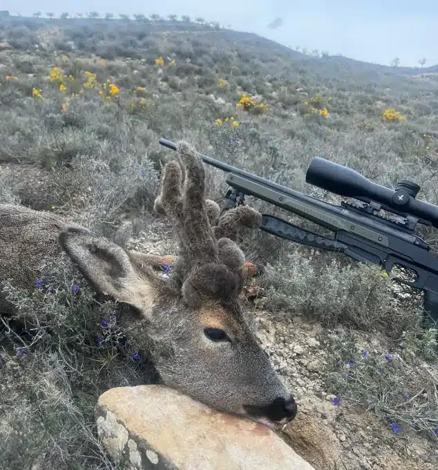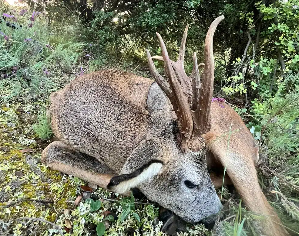 Cubero ha preferido no revelar el nombre exacto del pueblo donde lo abatió, pero sí detalla que la jornada empezó pronto, con una hembra tumbada en un sembrado como primer avistamiento. Desde allí decidió explorar dos barrancos cercanos, cubiertos de vegetación y con buena humedad, un hábitat ideal para el corzo. Fue entonces cuando, casi por sorpresa, se topó con el gran ejemplar.