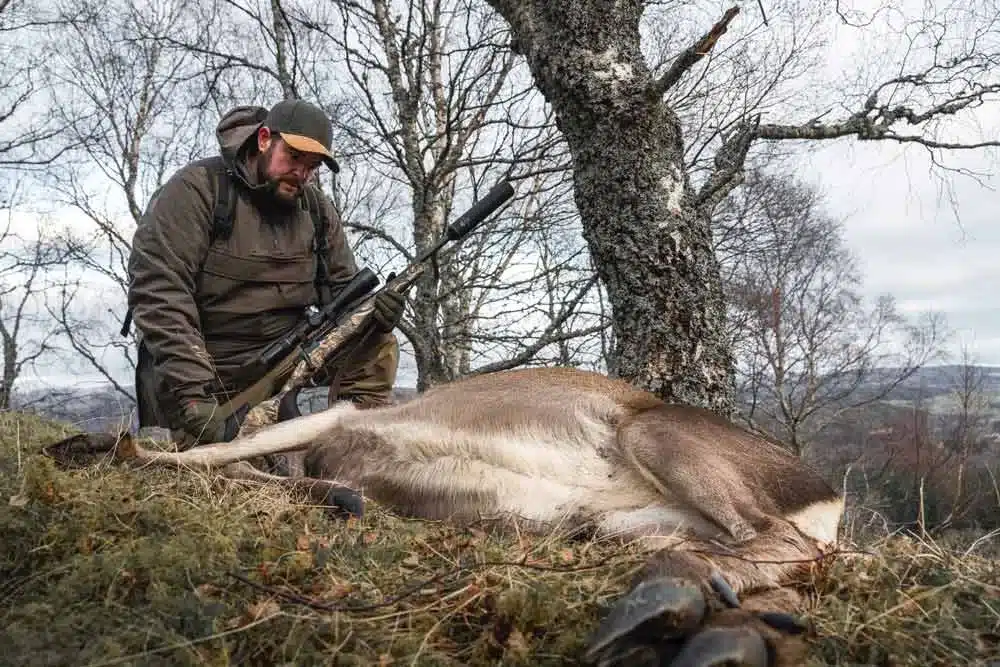 Durante el ascenso descubrimos una antigua tumba vikinga con el mar del Norte como fondo. El guía nos enseñó que los antiguos pobladores usaban las raíces del Sphagnum capillifolium para obtener agua dulce, algo que puso en práctica Adrien Koutney, responsable de prensa de Browning. A pesar de encontrar rastros recientes, no vimos ningún ciervo por la mañana. El guarda decidió cambiar de zona y, tras comer un bocadillo, ascendimos por un área más boscosa. Cuando el viento cambió, una pelota de ciervos nos olió y se esfumó colina arriba.