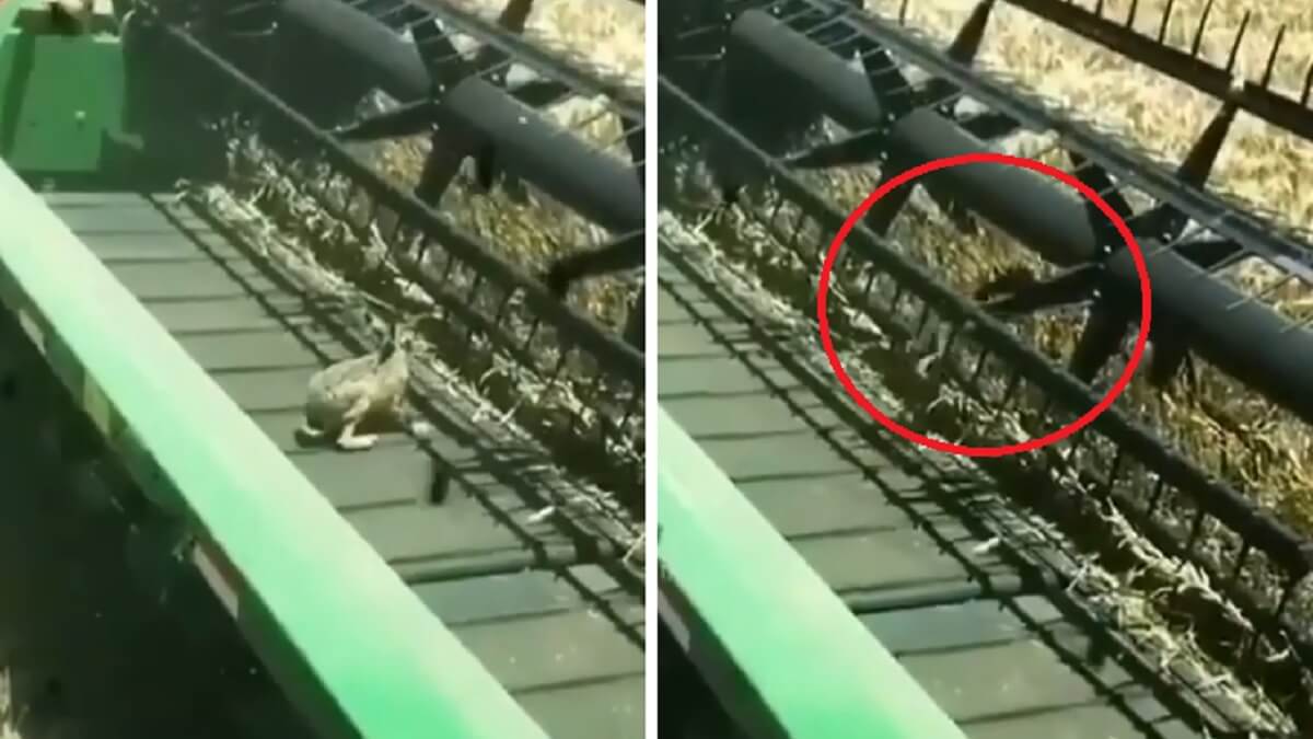 El vídeo que te mostramos a continuación da fe del peligro que corre cierta fauna silvestre en las épocas de cosecha en muchas zonas del planeta. En él se puede ver cómo una liebre intenta huir cuando ya se encuentra en la cinta transportadora de una cosechadora y a pocos centímetros de las cuchillas. De internarse dentro de éstas para el procesado del cereal, su muerte hubiese sido inmediata.