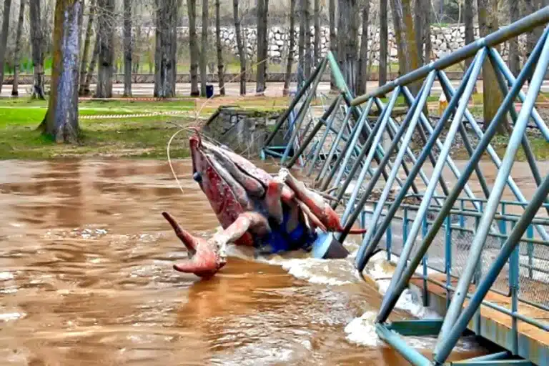 La fuerza del río no solo ha desplazado la escultura, sino que también ha causado desperfectos visibles. Según se aprecia en la imagen difundida, el cangrejo aparece tumbado y golpeado, con parte de la estructura enganchada, como si el Duero lo hubiese zarandeado sin contemplaciones antes de dejarlo encallado.
