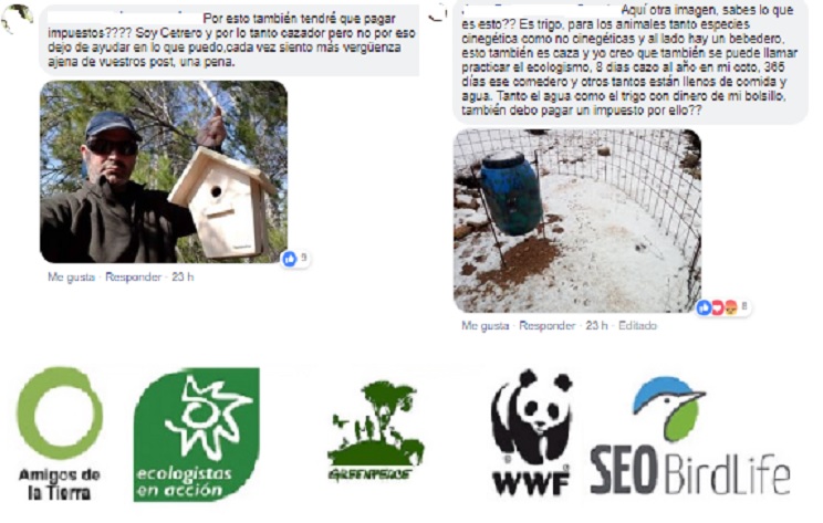 Otro, por su parte, mostraba una imagen con un recipiente con grano y explicaba «es trigo, para los animales tanto especies cinegética como no cinegéticas y al lado hay un bebedero, esto también es caza y yo creo que también se puede llamar practicar el ecologismo. 8 días cazo al año en mi coto, 365 días ese comedero y otros tantos están llenos de comida y agua. Tanto el agua como el trigo con dinero de mi bolsillo, ¿también debo pagar un impuesto por ello?», se preguntaba. Otro internauta indicaba a SEO/BirdLife que este tipo de decisiones eran las que le habían motivado a darse de baja de la asociación.