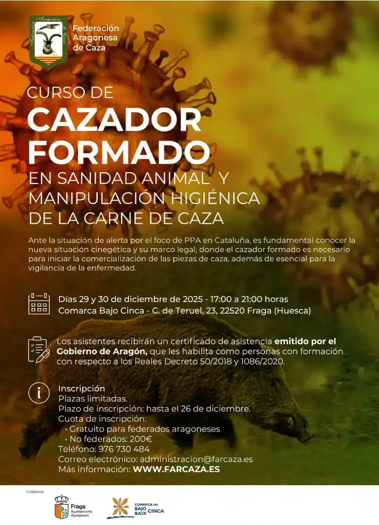 El curso se celebrará los días 29 y 30 de diciembre de 2025, en horario de tarde, en la comarca del Bajo Cinca, concretamente en Fraga, y responde a la necesidad de que los cazadores cuenten con conocimientos específicos en materia sanitaria, tanto para el autoconsumo como para la posible comercialización de las piezas abatidas. La iniciativa cobra especial relevancia en un momento marcado por la alerta sanitaria derivada de la peste porcina africana detectada en Cataluña, que ha reforzado los controles y la exigencia de formación.