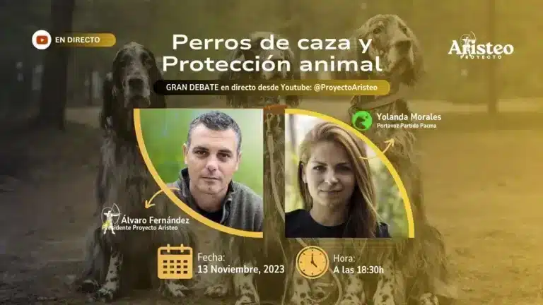 Este lunes 13 de noviembre, a las 18:30 horas, se celebrará un debate en vivo entre dos personas que representan a dos sectores opuestos: el de la caza y el del animalismo. El evento se podrá ver por el canal de youtube @proyectoaristeo y los protagonistas serán Álvaro Fernández, presidente del Proyecto Aristeo, y Yolanda Morales, portavoz y candidata del Partido Animalista (PACMA) a la Presidencia del Gobierno en las últimas elecciones generales.