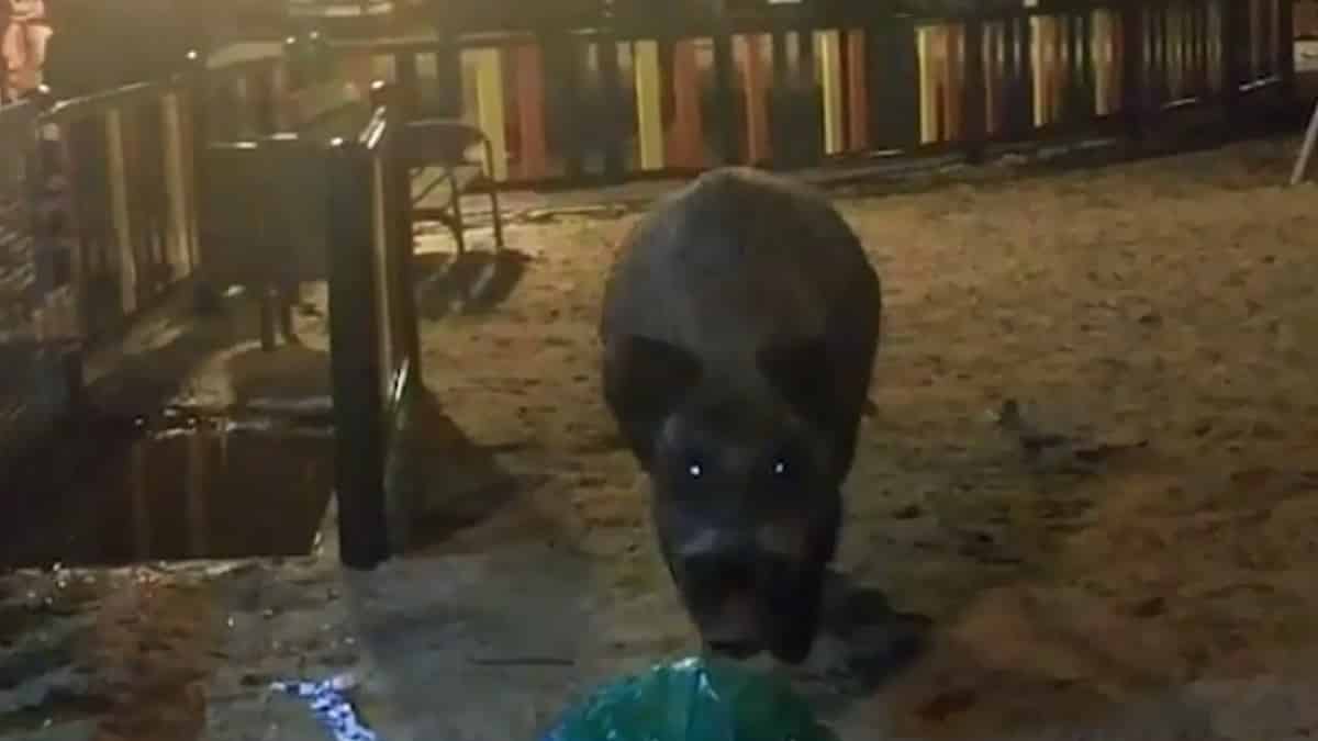 Las imágenes de este monstruoso animal no paran de compartirse en las redes sociales. Varios testigos graban mientras comentan frases como «Es gracioso» o «Si no hace nada…», desconociendo la peligrosidad que puede tener un jabalí. Te las mostramos.
