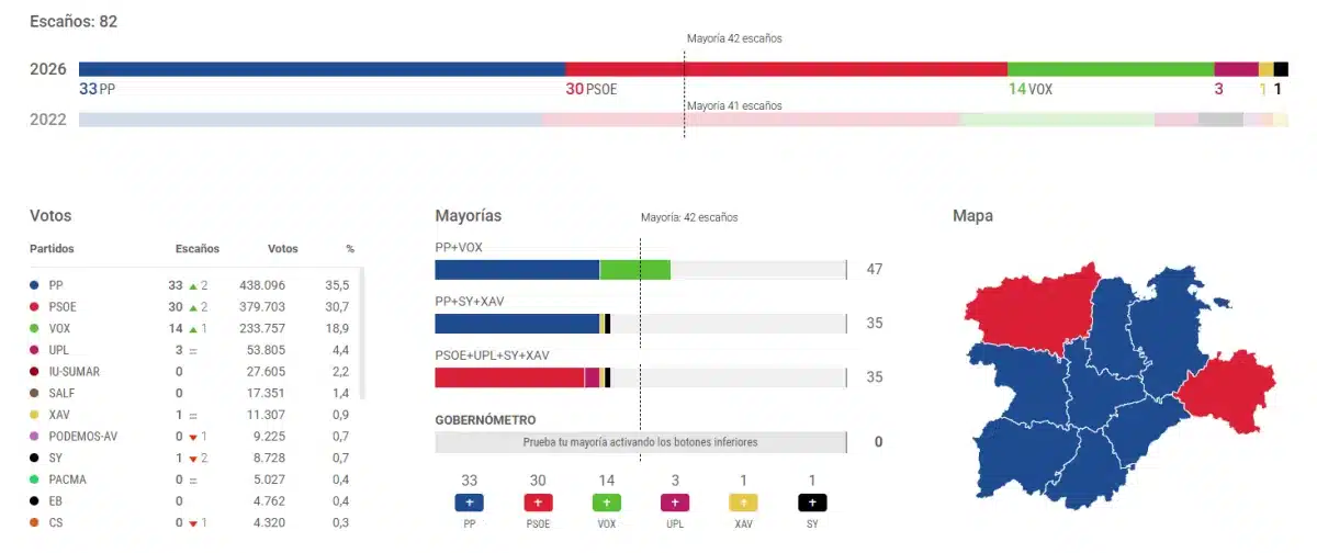 Mientras tanto, el reparto de escaños consolida a los grandes partidos. El PP se sitúa como fuerza más votada con 33 procuradores, seguido del PSOE con 30 y Vox con 14, muy lejos de las cifras de estas formaciones minoritarias.