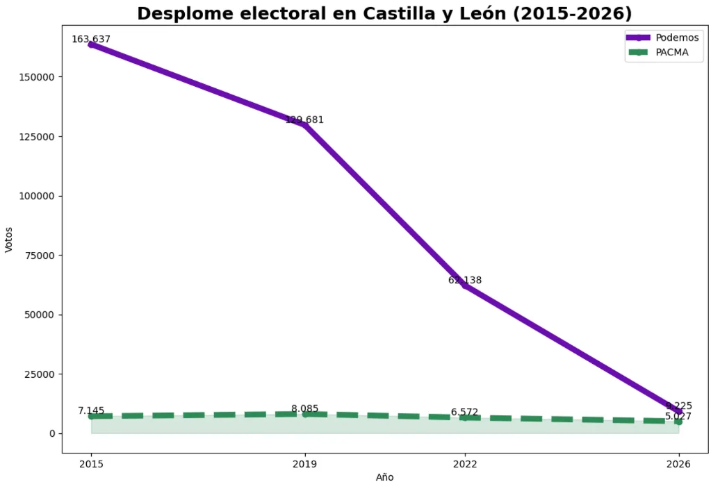 La evolución de los resultados evidencia una caída sostenida. En apenas una legislatura, Podemos ha pasado de tener representación a quedarse fuera, mientras que PACMA continúa sin lograr entrar en ninguna institución autonómica relevante.