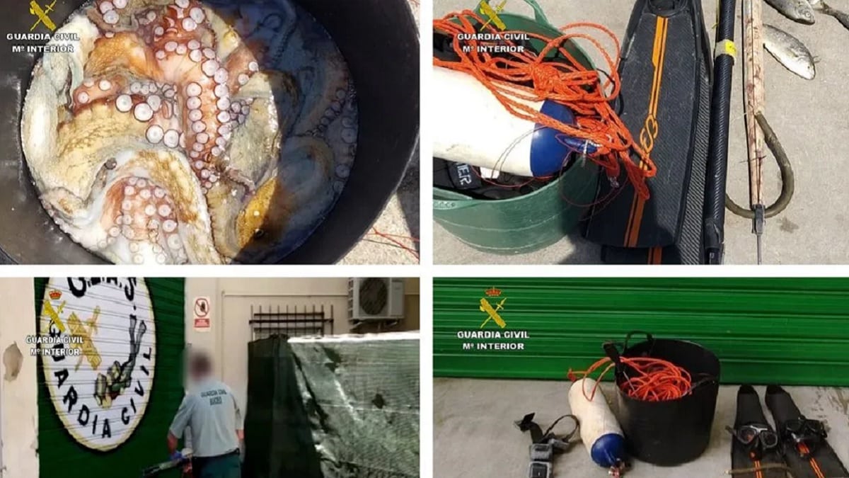 La Guardia Civil ha culminado la investigación con la incautación de 16 kilos de pulpo, que después de su análisis sanitario, han sido entregados a la beneficencia. También ha sido aprehendido un traje de buceo, un cinturón de plomos, dos máscaras de buceo, dos fusiles de pesca submarina y un cuchillo de buceador.