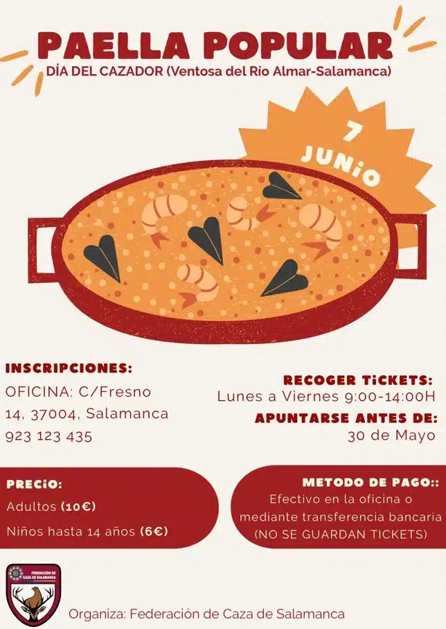 El momento central de la jornada llegará a las 15:00 horas, cuando se sirva una gran paella popular que pretende reunir a todos los asistentes en torno a la mesa. Para participar, es necesario adquirir los tickets de forma anticipada en la sede de la Federación (C/ Fresno 14, Salamanca), en horario de mañana. Los precios son de 10 euros para adultos y 6 euros para niños de hasta 14 años, y los tickets pueden abonarse en efectivo o por transferencia bancaria, aunque no se reservan sin pago previo.