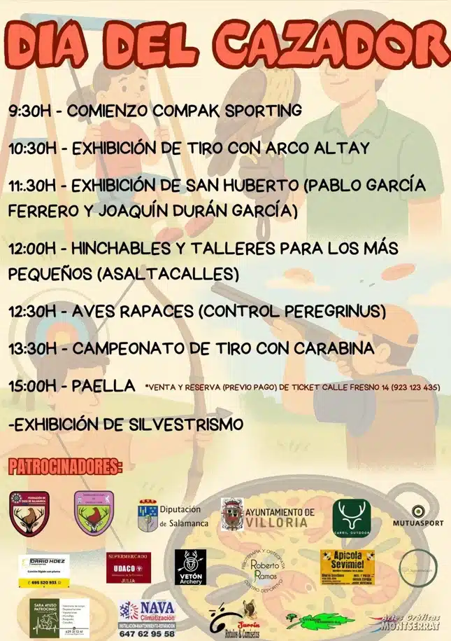 Durante todo el sábado, el campo de tiro Cascabeles acogerá competiciones, exhibiciones y propuestas lúdicas para todos los públicos. Desde primera hora de la mañana comenzará el compak sporting, seguido por el tiro con arco a cargo del club Altay, la exhibición de San Huberto con Pablo García Ferrero y Joaquín Durán García, y distintas actividades para niños como hinchables y talleres organizados por Asaltacalles. También habrá exhibición de aves rapaces, campeonato de tiro con carabina y una muestra de silvestrismo para completar un día repleto de tradición cinegética.