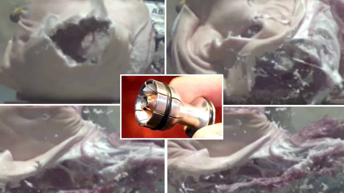 Este vídeo muestra cuán efectiva es la bala al atravesar diferentes paneles compuestos por gelatina balística, bloques de yeso y, lo más impresionante: un codillo de cerdo.