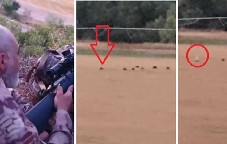 A 450 metros de distancia, cada acción de Rafa Carrillo es intachable por la pulcritud de cada uno de sus movimientos: apoya el arma, elige a uno de los jabalíes que se aleja unos metros del grupo, espera pacientemente a que se pare y se coloque de lado, apunta a esa considerable distancia y dispara hacia el guarro, que ni se entera del momento en el que es abatido. Este es el vídeo: