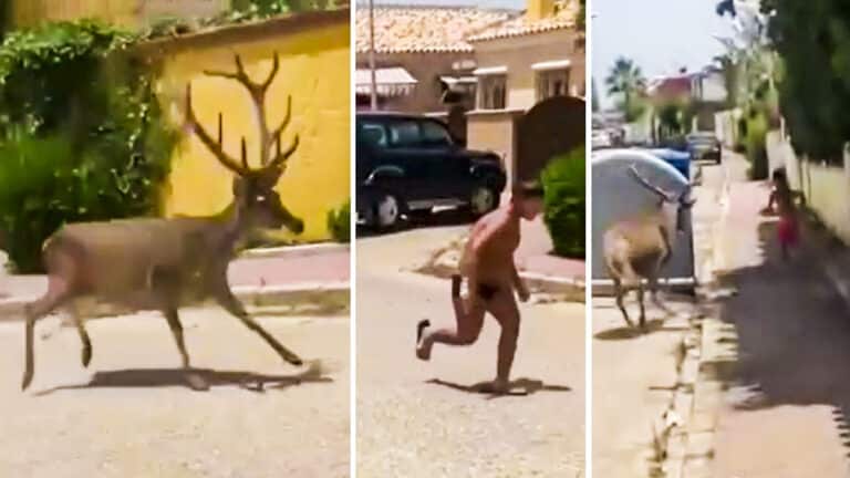 Se trata de una escena grabada hoy en las calles de la localidad onubense de Matalascañas y que podría haber acabado muy mal de no ser por el contenedor tras el que el pequeño pudo refugiarse para evitar la tarascada de los cérvidos.
