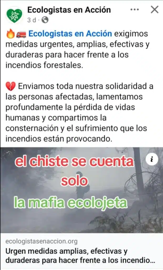 Con la temporada de incendios en su punto álgido, la misma organización difundió el pasado 14 de agosto un comunicado en su página oficial de Facebook en el que exigía al Gobierno central y a las comunidades autónomas acciones contundentes contra el fuego. «Enviamos toda nuestra solidaridad a las personas afectadas, lamentamos profundamente la pérdida de vidas humanas y compartimos la consternación y el sufrimiento que los incendios están provocando», expresaban.