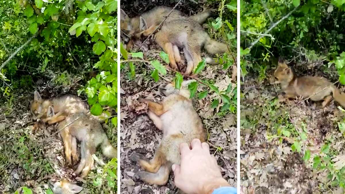 Tres crías de zorro duermen a pata suelta a la sombra de un zarzal. Permanecen ajenos al hombre que ha filmado las siguientes imágenes y que, sin hacer apenas ruido, consigue acercarse hasta ellos con el móvil en la mano y tocarlos.