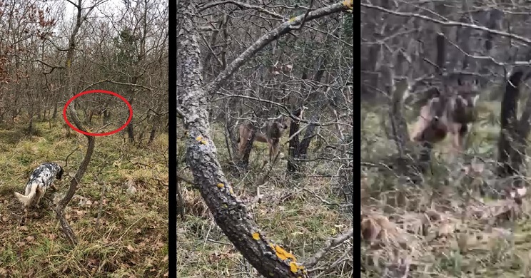 Durante los primeros segundos del vídeo aparece un setter que cruza la escena y, aunque parece no haber nada más relevante en ella, si nos fijamos bien al fondo, entre los árboles, podemos ver a un lobo. Poco después el cazador amplía la imagen para que lo podamos ver bien. Ahora sí: el cánido aparece en el centro de la filmación estático y atento a los movimientos de hombres y perros.