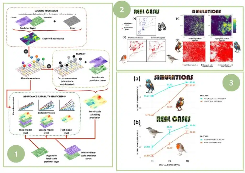 Para ello, se combinaron simulaciones computacionales y datos reales de campo. En las simulaciones, los investigadores controlaron de forma precisa cómo se distribuían las especies, qué variables influían realmente en su abundancia y qué escalas espaciales se utilizaban. En paralelo, aplicaron el mismo enfoque a datos reales de dos especies de aves invernantes en la península ibérica y Marruecos: el petirrojo europeo (Erithacus rubecula) y la curruca capirotada (Sylvia atricapilla).