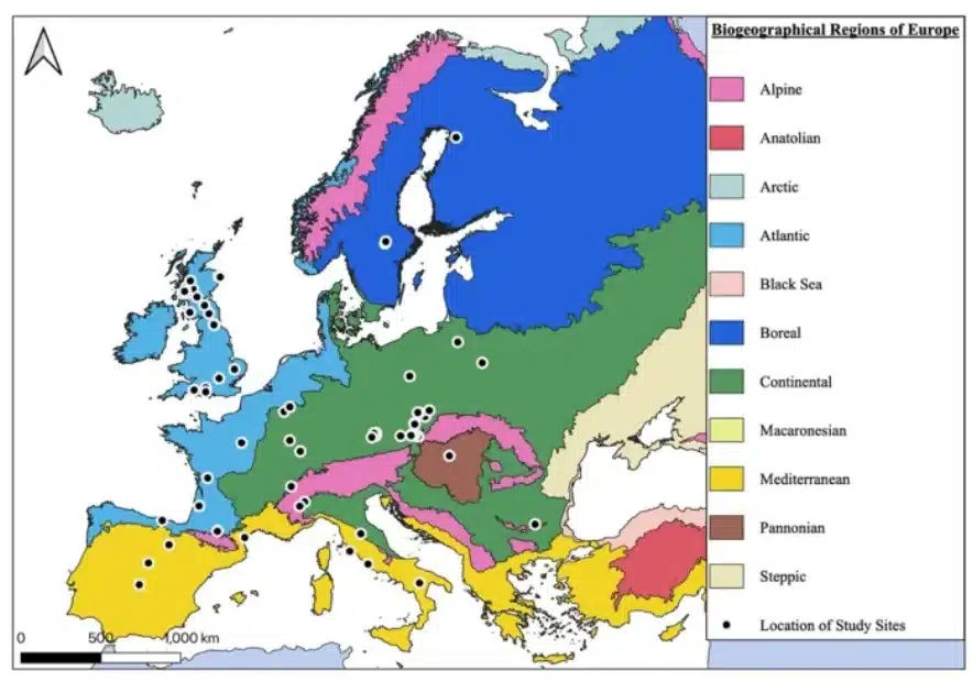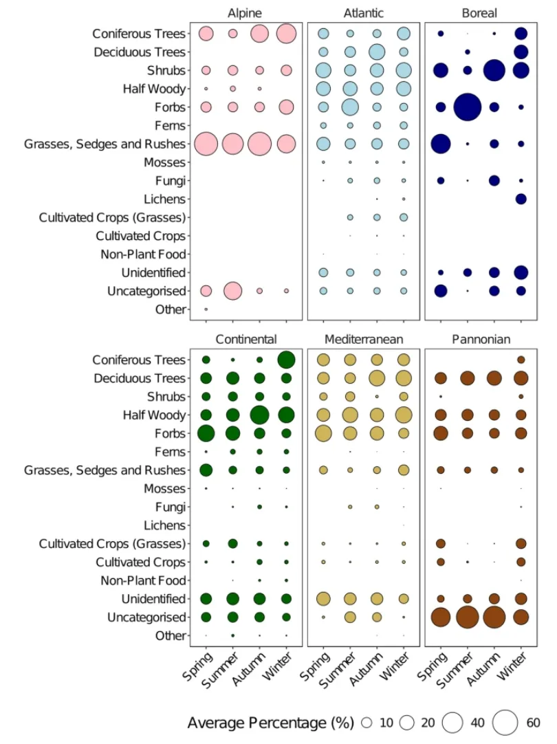 Los autores analizaron datos de dieta obtenidos mediante microhistología —identificación de fragmentos vegetales en heces o contenido ruminal— y aplicaron modelos estadísticos para comparar estaciones y regiones. Aunque la revisión abarca seis áreas biogeográficas, la parte más sólida del análisis se centra en tres (Atlántica, Continental y Mediterránea), las que tenían información suficiente.