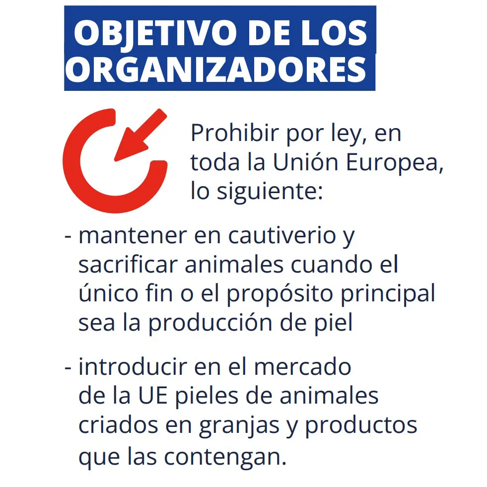 Tal y como puede leerse en el documento original publicado en la web de la Comisión Europea, los objetivos de esta medida son dos. En primer lugar «Prohibir por ley, en toda la Unión Europea, mantener en cautiverio y sacrificar animales cuando el único fin o el propósito principal sea la producción de piel e introducir en el mercado de la UE pieles de animales criados en granjas y productos que las contengan».