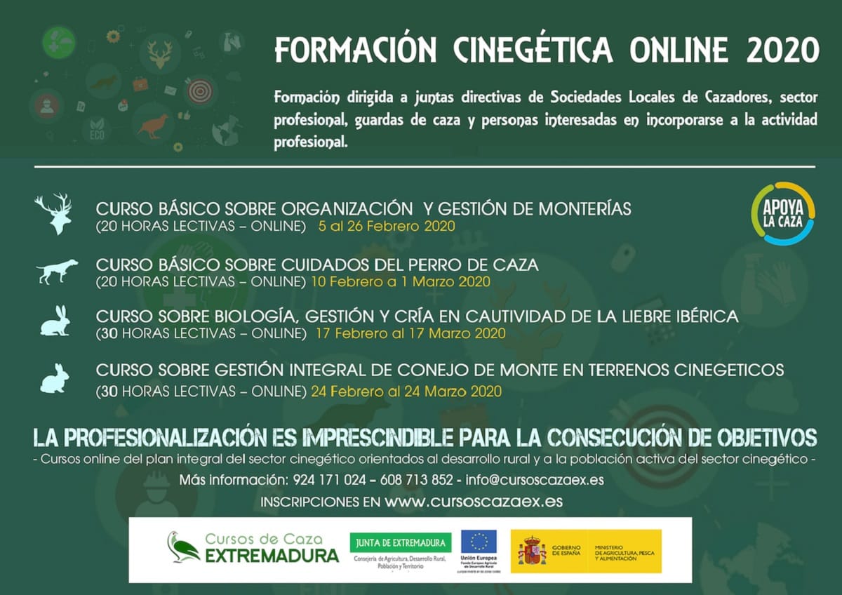 Las inscripciones ya están abiertas y pueden realizarse a través de la web www.cursoscazaex.es. Deberán formularse al menos cinco días antes de la fecha de inicio prevista de cada curso.