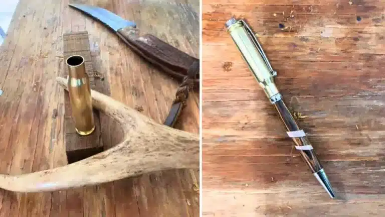 Una vaina de bala y una cuerna de ciervo para crear un bolígrafo