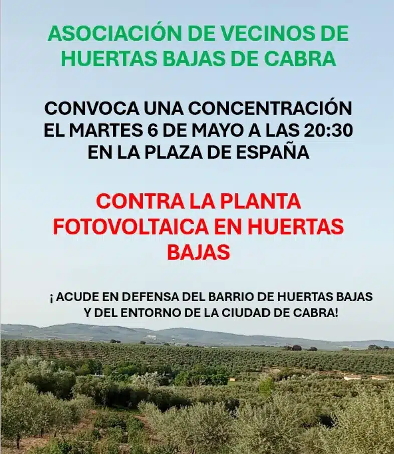 La concentración, que tendrá lugar a las 20:30 a las puertas del Ayuntamiento de Cabra, ha sido convocada por la Asociación de Vecinos de Huertas Bajas para protestar contra un proyecto que supondrá acabar con el entorno natural y paisajístico de Cabra y que, además, no generará ningún tipo de empleo ni riqueza en el medio rural egabrense, que se vería fuertemente afectado por la implantación de esta planta fotovoltaica.