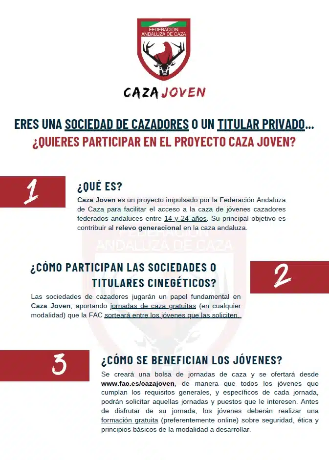 La Federación Andaluza de Caza (FAC) ha activado ya la segunda edición de su programa Caza Joven, una iniciativa que persigue abrir la actividad cinegética a las nuevas generaciones. Tras una primera campaña con buenos resultados, la entidad inicia ahora una nueva fase en la que solicita la implicación directa de sociedades de cazadores y titulares de cotos en toda Andalucía.
