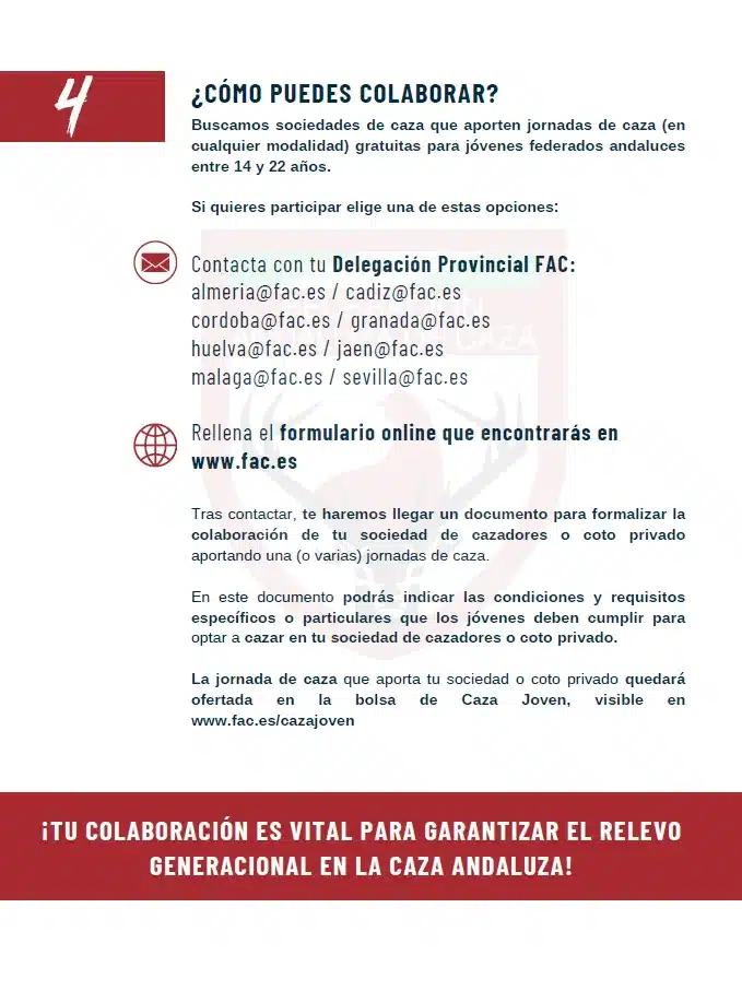 Desde la Federación subrayan que el éxito del programa depende directamente de la colaboración de las sociedades. En este sentido, el presidente de la FAC, José María Mancheño, ha querido destacar el papel que ya jugaron en la primera edición: «La implicación de las sociedades de cazadores en el proyecto Caza Joven fue fundamental para cosechar un gran éxito en el año de su lanzamiento. Desde la Federación animamos a las sociedades de caza andaluzas a que se unan a la Federación para ofrecer experiencias y jornadas de caza que ayuden a perpetuar la afición de los jóvenes por la caza y mejorar su formación».
