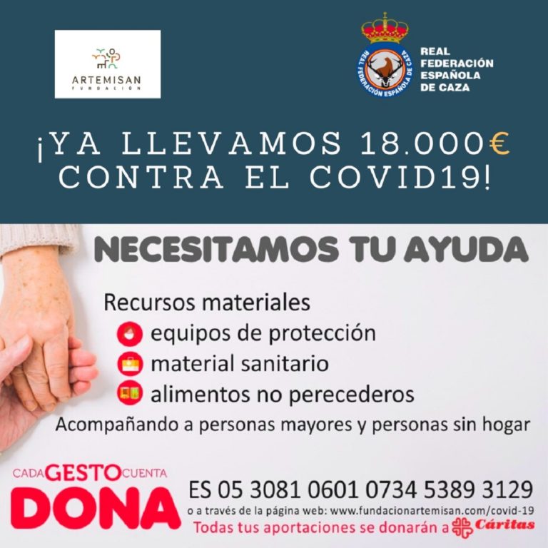 La Real Federación Española de Caza (RFEC), las federaciones autonómicas y la Fundación Artemisan han anunciado en un comunicado de prensa la donación «de 18.000 euros al proyecto Cáritas ante el Coronavirus que iniciaron estas entidades este martes, 31 de marzo, para poder dotar de recursos materiales a las personas más vulnerables que están padeciendo las graves consecuencias de esta enfermedad infecciosa.