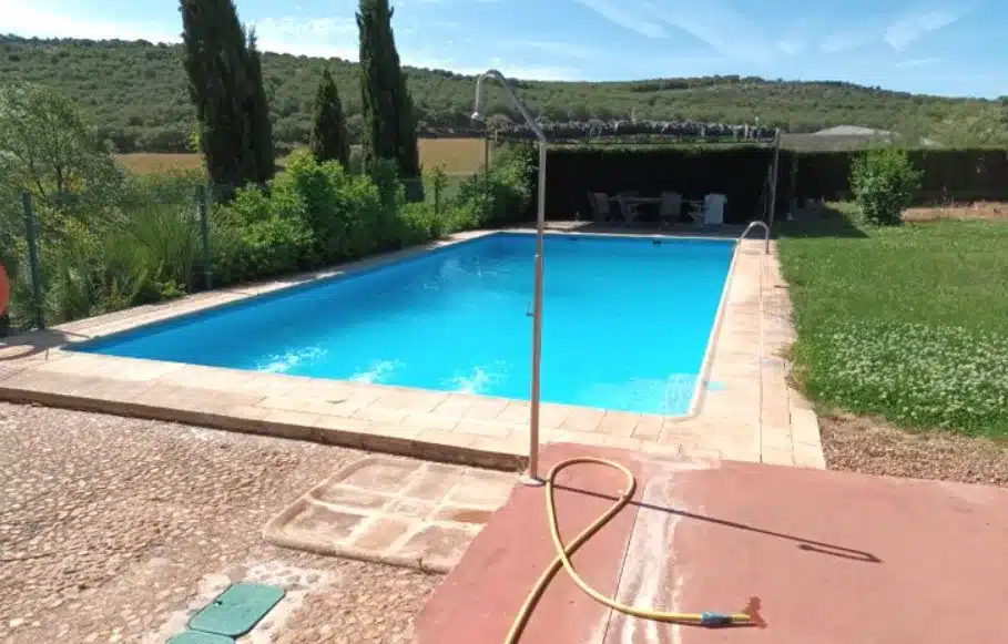 Más allá del terreno, la finca cuenta con una vivienda principal de gran tamaño, completamente equipada, con varias habitaciones, zonas comunes amplias y servicios modernos como calefacción por biomasa, conexión a internet y espacios exteriores ajardinados con piscina.