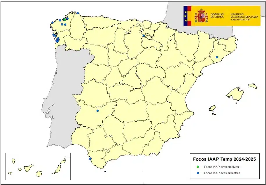 La temporada 2024-25 ha resultado, por el momento, menos preocupante que campañas anteriores. Desde el 1 de julio de 2024 se han contabilizado en España un total de 25 casos en aves silvestres y 1 en aves cautivas, sin que se haya producido ningún contagio en explotaciones avícolas comerciales. Esto permite que España mantenga su estatus de país libre de IAAP en aves de corral.