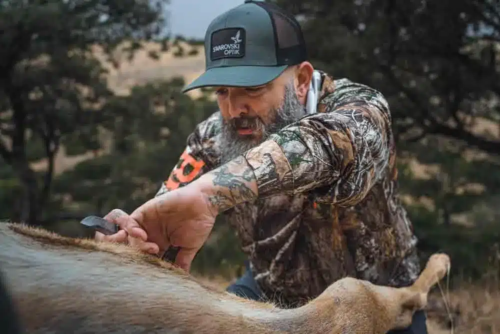El Fandi decide rodear la mancha, aprovechar vaguadas y ganar metros sin ser visto. El avance es lento, técnico y preciso. Finalmente, ya dentro del rango ético de tiro, un gamo adulto aparece entre las carrascas. Un lance certero a unos ciento cincuenta metros resuelve la acción con limpieza, mostrando la parte de la caza que rara vez aparece fuera del ámbito profesional: la toma de decisiones, el respeto por el animal y la coherencia con los criterios de selección.