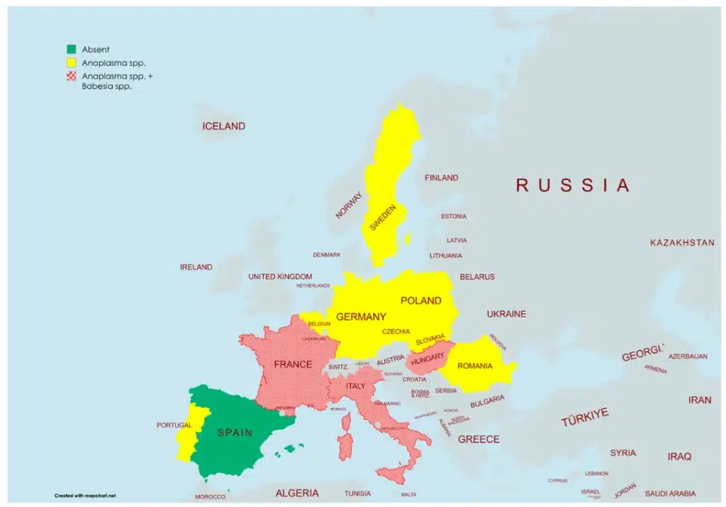 La prevalencia más alta de Anaplasma se ha detectado en Eslovaquia (28,2 %), mientras que para Babesia los niveles son mucho más bajos, con un máximo del 1,5 % registrado en Hungría. En España, todos los estudios realizados han arrojado una prevalencia del 0 % para ambas enfermedades, aunque los autores matizan que pueden existir variaciones metodológicas que influyan en los resultados.
