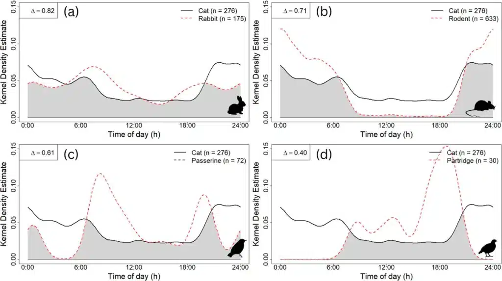 Los resultados no dejan lugar a dudas: los gatos muestran un altísimo solapamiento horario con conejos (Oryctolagus cuniculus), roedores y perdices rojas (Alectoris rufa), lo que evidencia una intensa presión predatoria sobre especies cinegéticas. Este patrón de actividad refleja que los gatos aprovechan al máximo los periodos de actividad de sus presas, especialmente durante el crepúsculo y la noche.
