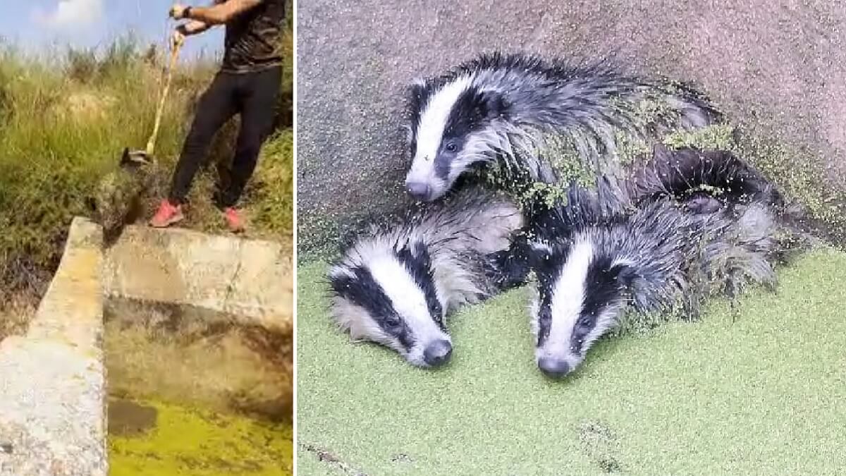 Dos cazadores han rescatado esta semana a tres tejones que estaban a punto de morir tras caer a una balsa de riego en Picassent, en la provincia de Valencia. Este es el vídeo del rescate.