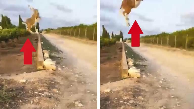 Nuestro seguidor Eduardo Sánchez nos envía desde Valencia las imágenes que su amiga Sara pudo grabar hace días cuando paseaba con sus dos podencas por un campo de naranjos. En ellas se ve cómo una liebre asustada por los canes corre hacia un camino y, al toparse con las personas que grababan el siguiente vídeo, da un salto de infarto.