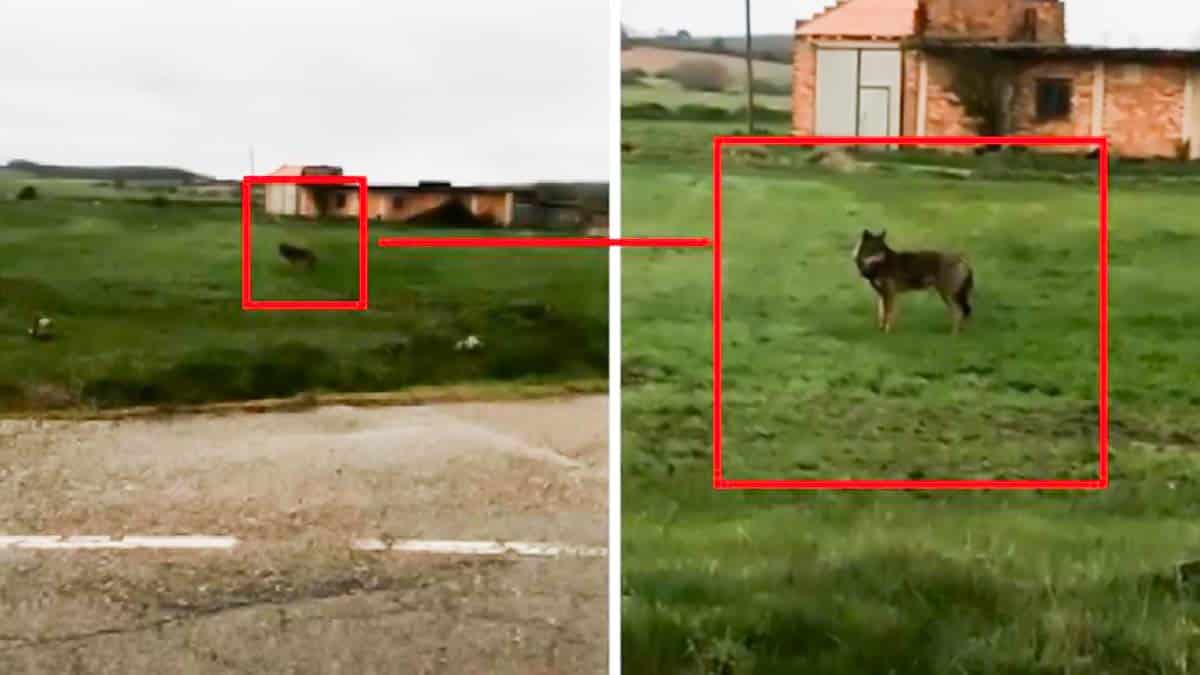 Estas son las imágenes del lobo deambulando este viernes 17 de abril por las cercanías de Cubillo de Castrejón, pedanía de la localidad de Castrejón de la Peña, en la provincia de Palencia.