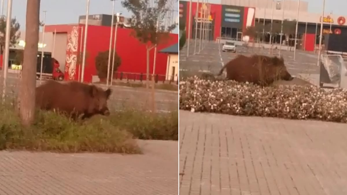 Un enorme jabalí se pasea por un área comercial ante la atónita mirada de un conductor, que lo graba. El jabalí, sin miedo al humano, sigue con su ruta con total tranquilidad.