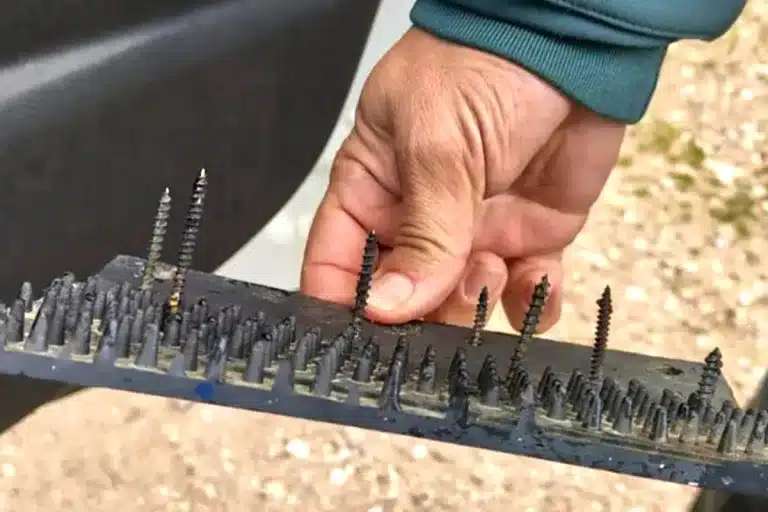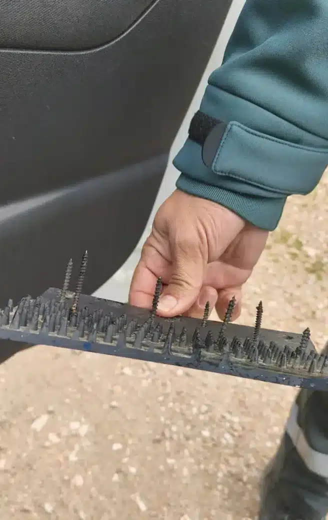 El objeto mostrado es una pieza alargada con múltiples clavos atornillados en vertical, preparada para quedar oculta o semiescondida y provocar reventones en cuanto un coche o moto pase por encima.