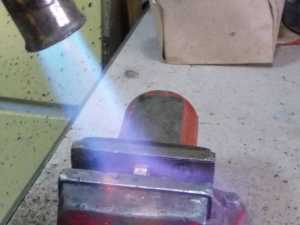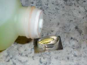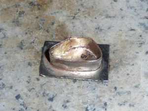 Una vez secado el relleno, construimos los casquillos con una tira de alpaca de siete milímetros. Rodeamos con ella cada uno de los colmillos y los cortamos a medida de su base (4.1). Soldamos el anillo formado con la ayuda de un soplete y una varilla de plata (4.2) de la siguiente manera: con un típico tornillo de taller mantenemos el anillo unido, aplicamos decapante para soldadura y calentamos con el soplete. Una vez se evapore el decapante arrimamos la varilla de soldadura hasta que suelte una pequeña gota. Ésta se expandirá por la superficie en la que aplicamos el decapante si continuamos aplicando calor con el soplete… y ya estará soldada (4.3).