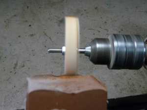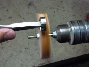 Con ayuda del taladro provisto de un disco de fieltro o tela pulimos los casquillos: mientras gira, apoyamos el disco en la pasta especial para pulir alpaca (6.1). Después arrimamos los casquillos al disco (6.1), puliendo así toda su superficie, y los limpiamos con algodón y alcohol. Ahora tendrán un brillo similar al de la plata.