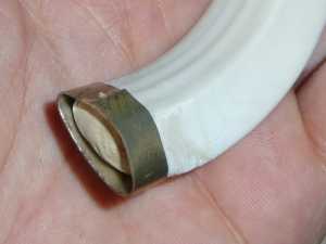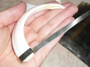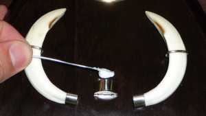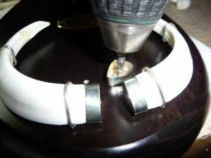 Pegamos los casquillos a las navajas con pegamento ultrafuerte. Con pasta de pulir blanca y un disco de fieltro pulimos la superficie de todos los colmillos limpiándolos a continuación con algodón y un poco de alcohol.