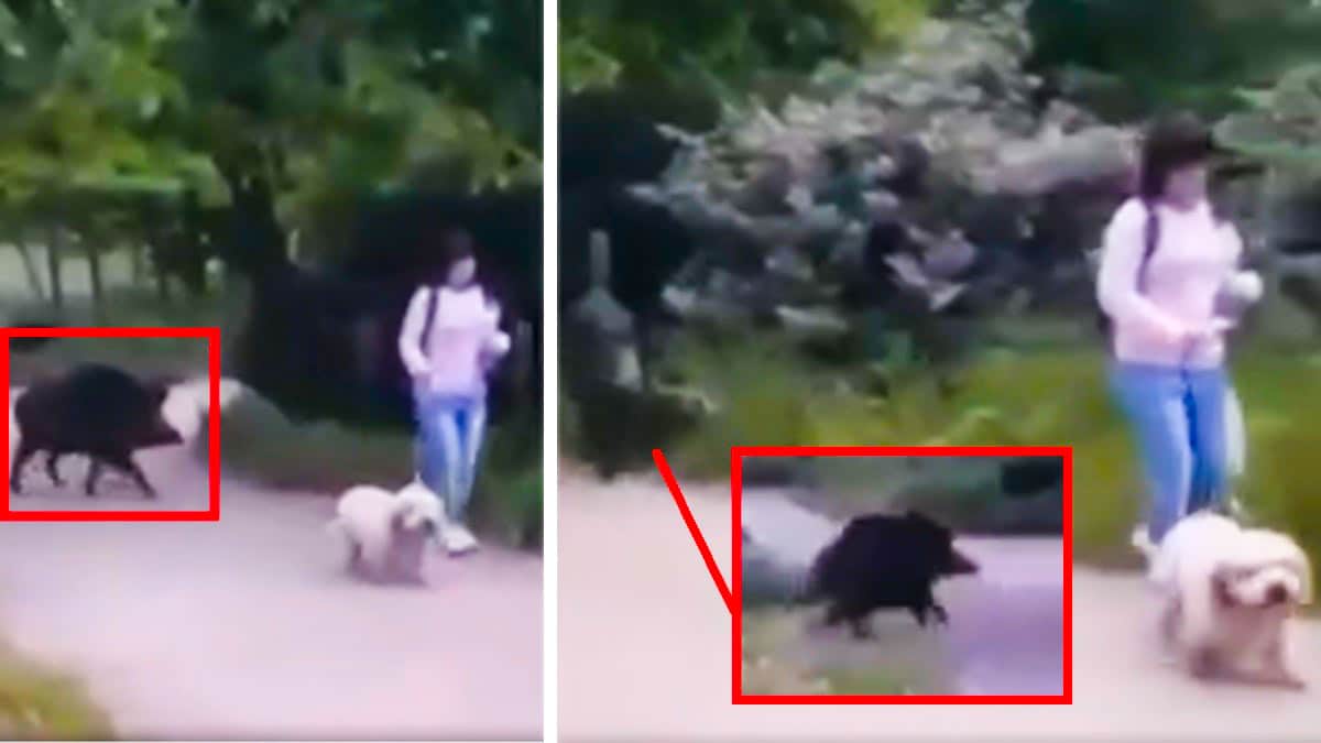 Tal y como se puede ver en la grabación, una hembra de jabalí de un considerable tamaño, visiblemente cabreada, comienza a acosar a una mujer que pasea a su perro. En la imagen se puede apreciar cómo el gran animal amaga con atacarla.