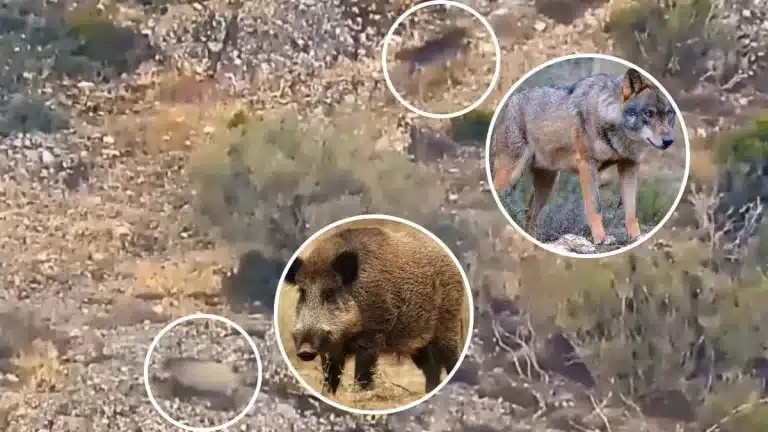 El primero de ellos es un ejemplar de lobo que lleva en la boca un pequeño jabalí, con la aparente intención de llevárselo lejos del lugar. Detrás de él, una jabalina corre a toda velocidad, la que entendemos que es la madre de la cría, para salvar al rayón del ataque del depredador.