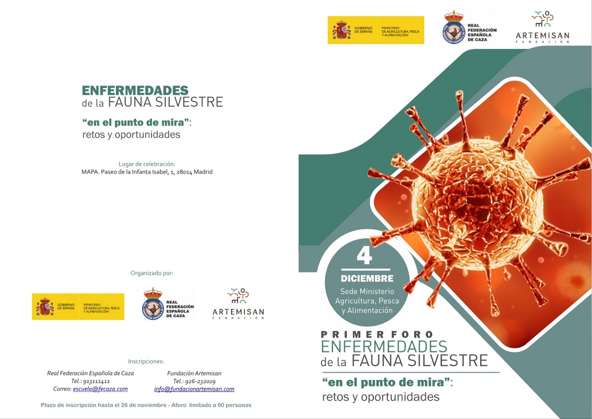 El Ministerio de Agricultura, Pesca y Alimentación, junto con la Real Federación Española de Caza y la Fundación Artemisan, celebrará el próximo 4 de diciembre en Madrid el ‘I Foro sobre enfermedades de fauna silvestre. Retos y oportunidades’. Se trata de un encuentro dirigido a cazadores, propietarios y titulares de cotos, técnicos de las administraciones competentes en caza y sanidad animal y gestores.