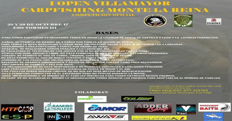 El próximo día 28 y 29 de Octubre, se celebrará el I Open de Carpfishing en Villamayor (Salamanca), organizado por las Lagunas de Monte la Reina y de la mano de Fran Requejo. Serán dos jornadas de pesca donde se permitirá pernoctar, pero sin poder pescar de noche, ya que no está permitido según la normativa de pesca de la junta de Castilla y León.