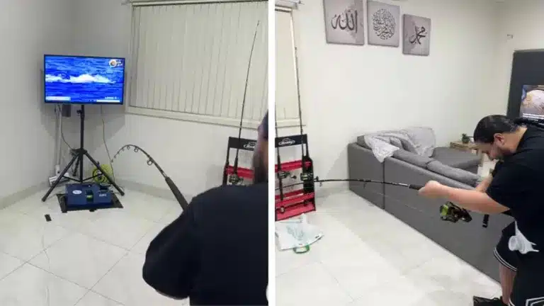 En pleno salón de su casa, el protagonista de estas imágenes ha podido vivir una auténtica experiencia de pesca. Lo único que lo diferencia de la realidad es el escenario. Eso de no estar en medio del agua le quita cierto encanto, pero es suficiente para sentir que estás en contacto con esta actividad.